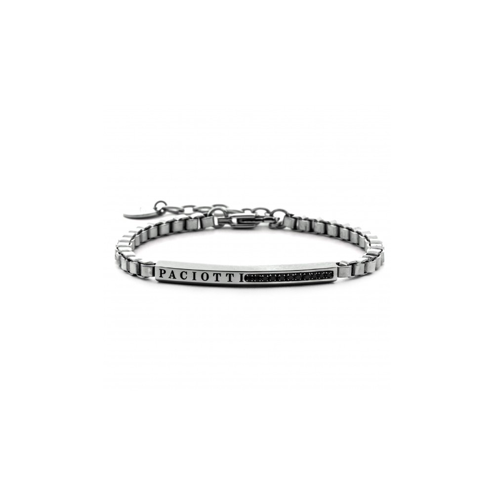 Bracciale 4US Cesare Paciotti da uomo in acciaio di colore silver con zirconi neri ai lati e targhetta centrale con zircone nero.