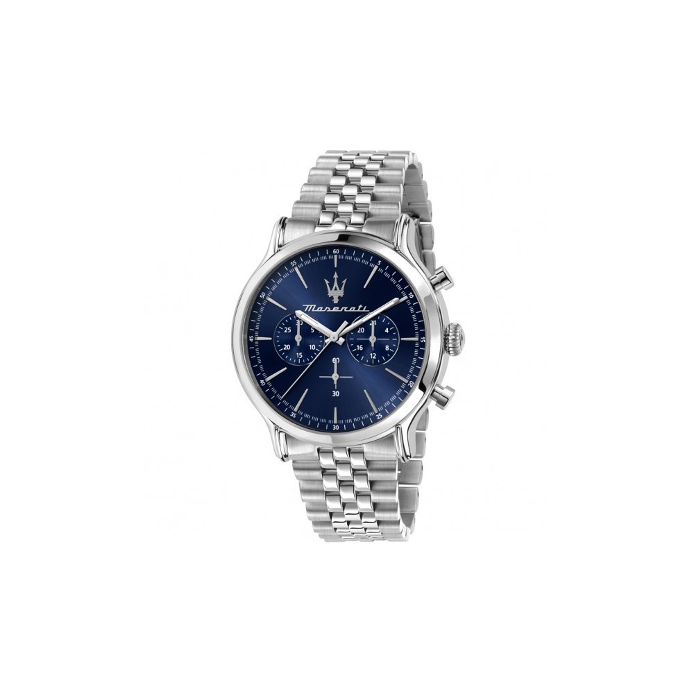 Orologio cronografo da uomo di maserati della collezione epoca. Orologio con cassa in acciaio lucido di 42 mm con vetro minerale. Bracciale in metallo di colore argento con chiusura a fibbia deplojante con pulsanti. Orologio con 3 contattori con datario e resistenza all'acqua di 10 atm. La referenza è r8873618017