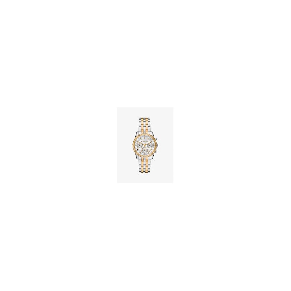 Orologio cronografo della collezione Michael Kors Bryant da donna. Colore cassa: argento; colore del quadrante: argento; colore del bracciale: oro e argento. Cassa di diametro 35 mm in acciaio inossidabile 316L con datario sul quadrante e cristalli sulla ghiera. Vetro minerale. Bracciale in acciaio inossidabile 316L con trattamento in pvd oro con chiusura deployante. Movimento al quarzo. Classificazione di impermeabilità (WR) 5 ATM
