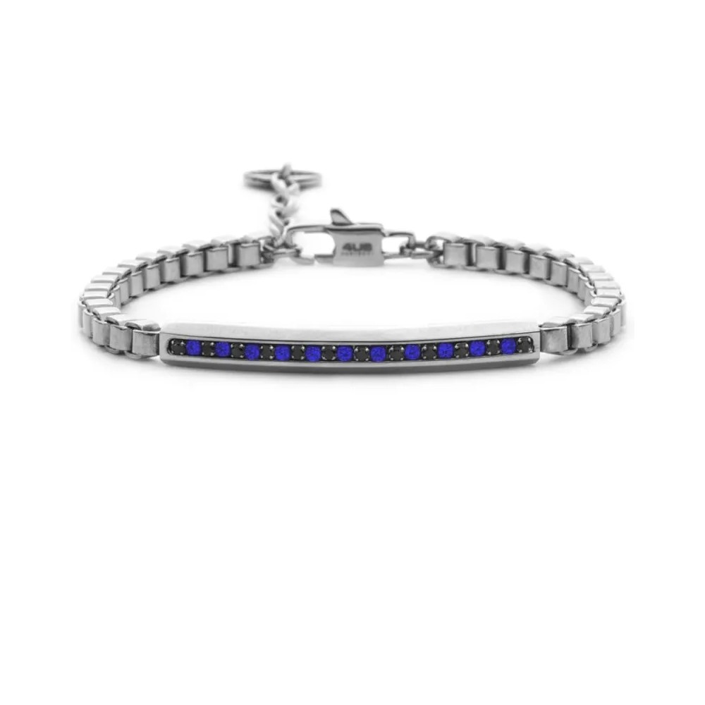 Gioiello da Uomo 4US CESARE PACIOTTI della collezione STEEL realizzato in acciaio inossidabile 316L - Il bracciale, caratterizzato da una maglia a catena, è valorizzato da una targhetta centrale impreziosita da una fila di zirconi neri alternati a luminosi zirconi blu - Chiusura con moschettone - Lunghezza regolabile da 18 a 21 cm - Garanzia Internazionale: 24 Mesi - Tutti i gioielli sono privi di nickel e ipoallergenici - Nella spedizione invieremo tutto il necessario per fare una confezione regalo