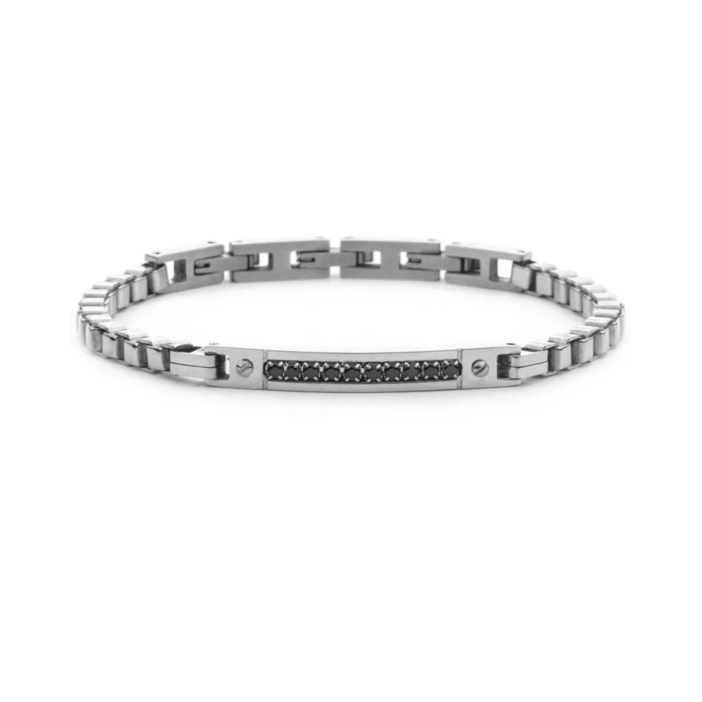 Gioiello da Uomo 4US CESARE PACIOTTI della collezione STEEL realizzato in acciaio inossidabile 316L - Il bracciale è valorizzato da una targhetta centrale impreziosita da una fila di zirconi neri e da una vite ai lati della targhetta - Chiusura con gancio a scatto - Lunghezza regolabile da 18 a 21 cm - Garanzia Internazionale: 24 Mesi - Tutti i gioielli sono privi di nickel e ipoallergenici - Nella spedizione invieremo tutto il necessario per fare una confezione regalo
