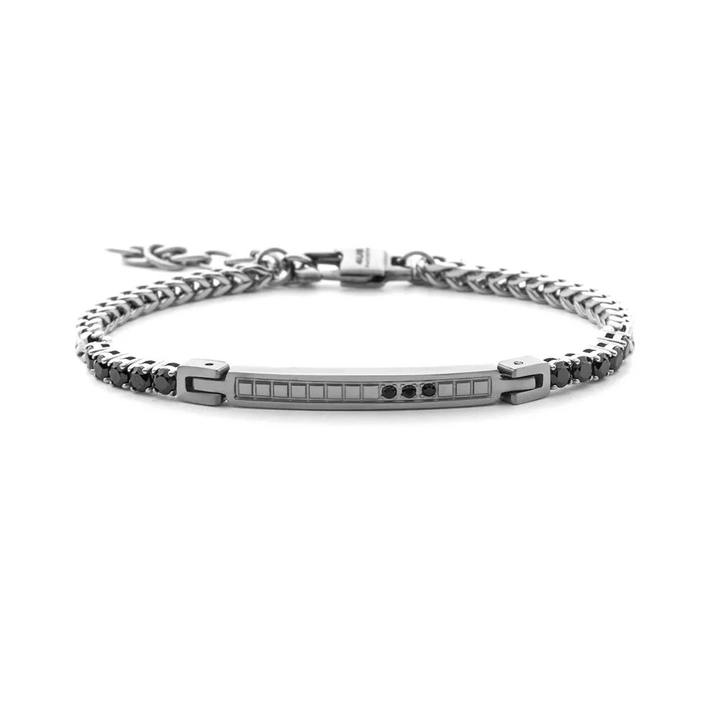 Braccialetto da uomo realizzato in acciaio anallergico con finitura rodiata. Targa centrale con logo e fila di zirconi neri.