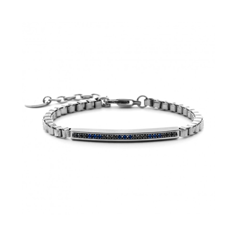 Braccialetto da uomo realizzato in acciaio anallergico con finitura rodiata. Targa centrale con fila di zirconi neri e blu. Ha lunghezza totale di 22 cm, regolabile fino a 18 cm. Chiusura con moschettone. L'articolo è venduto su concessione ufficiale e viene spedito in tutto il mondo completo di confezione, shopper e garanzia autentica valida 24 mesi