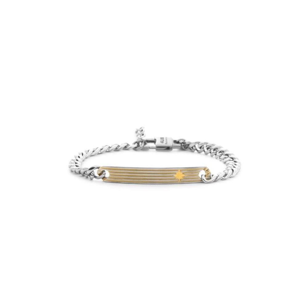 Bracciale Da Uomo del brand 4US Cesare Paciotti. Il giropolso è realizzato da una catena in acciaio lucido, d'intermezzo placchetta rigata dorata. La lunghezza totale di 21 cm, regolabile fino a 18 cm grazie agli anellini di longhina. La chiusura è con maglia a moschettone. Questo articolo verrà spedito con Scatola e garanzia Originali 4US Cesare Paciotti