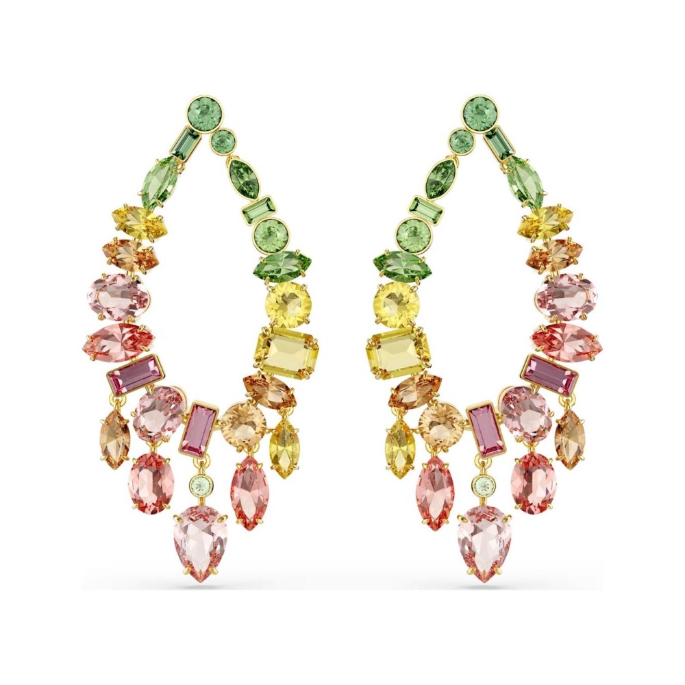 Orecchini pendenti della collezione Swarovski Gema da donna. Colore: oro e multicolor. Gli orecchini, realizzati in lega di metalli anallergica placcato dorato, presentano una varietà di cristalli di diverse forme e colori, tutti disposti in un cerchio. Dimensione: 6.5 x 3.8 cm. Chiusura a perno.