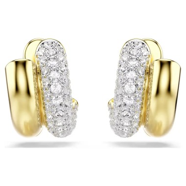 Orecchini a cerchio della collezione Swarovski Dextera da donna. Colore: oro. Gli orecchini sono in lega di metalli anallergica placcata oro e sono caratterizzati da tre anelli interconnessi impreziositi da cristalli Cry. Dimensione: 3,5 x 3,5 x 4 cm. Chiusura: cerniera a molla.