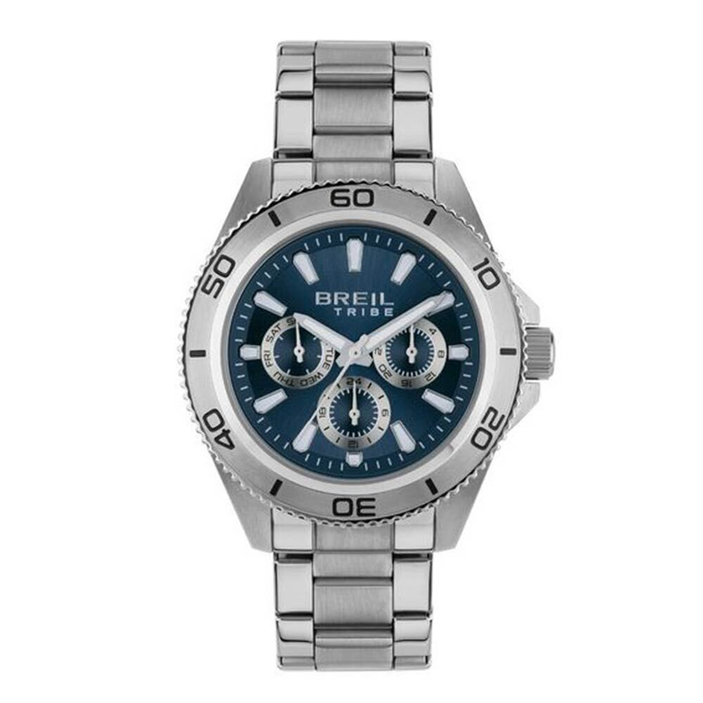 Orologio multifunzione da uomo di Breil della collezione Challange. Orologio multifunzione con movimento al quarzo mIYOTA 6P29. Ha la cassa in acciaio con finitura satinata di uno spessore di 11,5mm. La lunetta è in acciaio con dettagli blu. Il quadrante è blu con effetto sun ray e con indici con luminous. I contatori sono neri con effetto CD ring. Ha sfere silver e vetro minerale. Il fondello è a vite. Il bracciale è in acciaio con binitura bilux. La chiusura è con pulsanti e fermaglio di sicurezza. La resistenza all'acqua è di 5atm. La misura è di 42mm. La referenza è EW0710